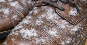 I pulled out shoes I haven’t worn all winter and found white fuzzy patches growing on the leather. What is this?